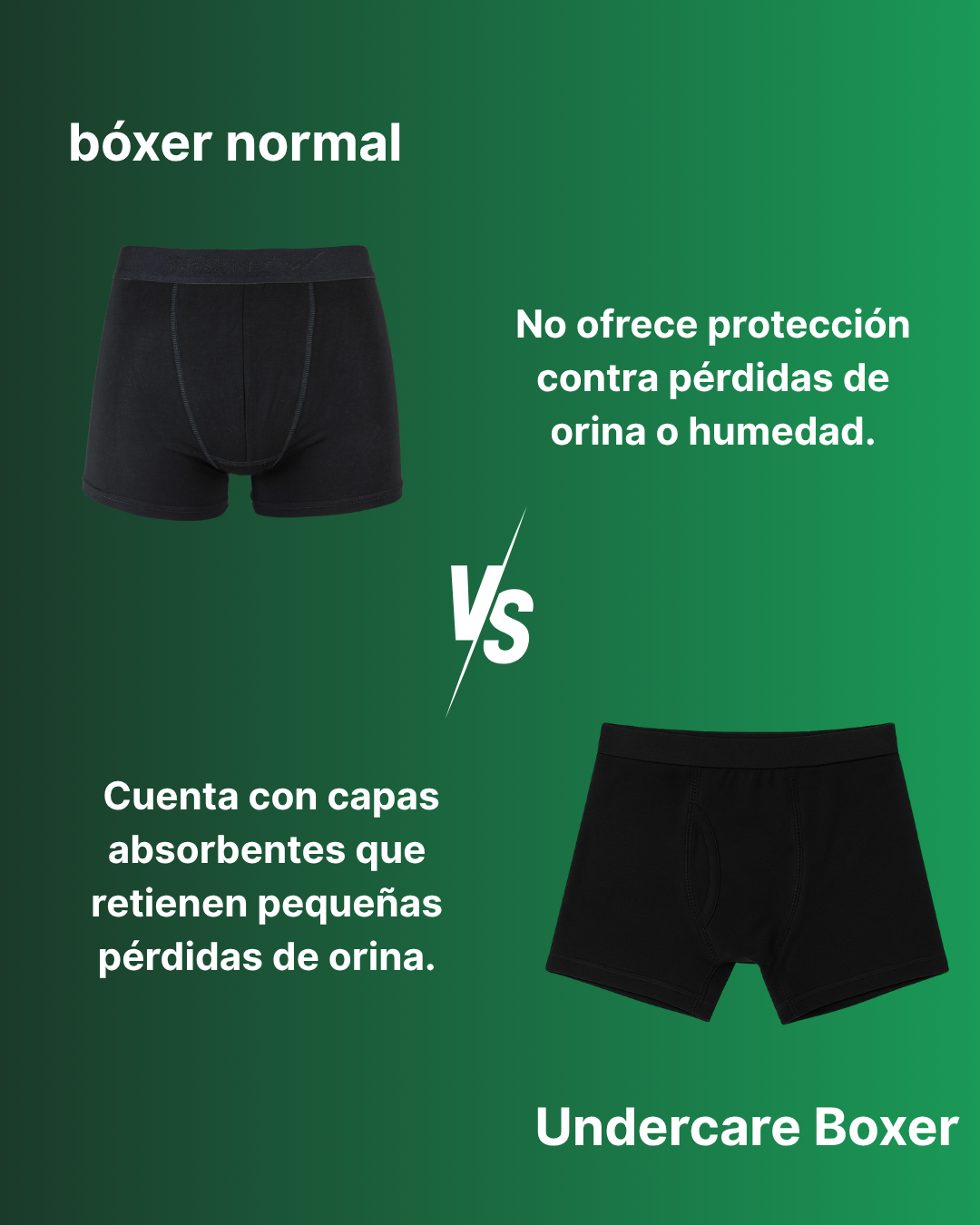 No dejes que las pérdidas de orina o la incontinencia leve controlen tu vida. Los Undercare Boxers te ofrecen la solución fiable que estabas buscando.